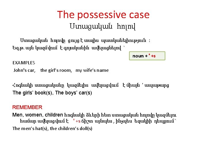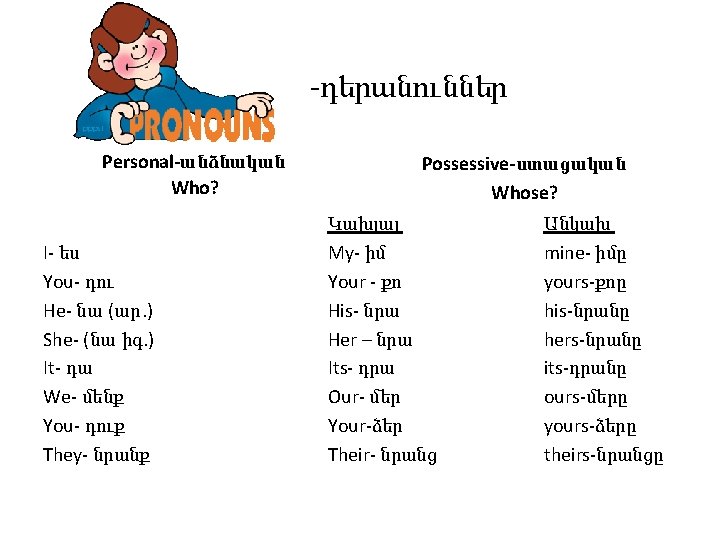 Questions with question words Հարցական նախադասություն հարցական բառերով What -ինչ is her surname? is his job? Is her address? Jefferson. He’s a policeman. 34, Church Street. Where-որտեղ is she are you are they Who-ով is Lara? is she? She’s Patrick’s daughter. How old-քանի տարեկան is he? are you? Twenty-two. Thirty years old. How much-որքան Is an ice-cream? One pound. from? Mexico.