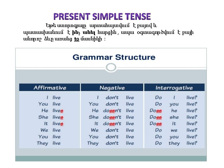Present Simple-Ներկա անորոշ 1. Անորոշ ներկան օգտագործում ենք ընդհանուր հայտնի փաստերի հետ • It snows in winter. • The sky isn't green. • Plants die without water. Key words • Two and two make four. Մակբայները միշտ դրվում են բայից • Water boils at 100°C. առաջ , իսկ բառակապակցությունները 2. Կրկնվող գործողություն ներկայւմ նախադասության սկզբում կամ վերջում : • Where do you live? • She works in a bank. • They love coffee. always-միշտ 3. Սովորությունների հետ usually-սովորաբար • Do you smoke? • I play tennis every Tuesday. often-հաճախ • We often go to the cinema. sometimes-երբեմն 4. Ապագայի համար , հատկապես 'when', 'until', 'after', 'before' և 'as soon as' բառերի հետ never-երբեք seldom-հազվադեպ • School begins at nine tomorrow. • Our train leaves at eleven. every day-ամեն օր • What time does the film start? • • I will call you when I have time. I'll give you the book before you go. every month-ամեն ամիս every year-ամեն տարի