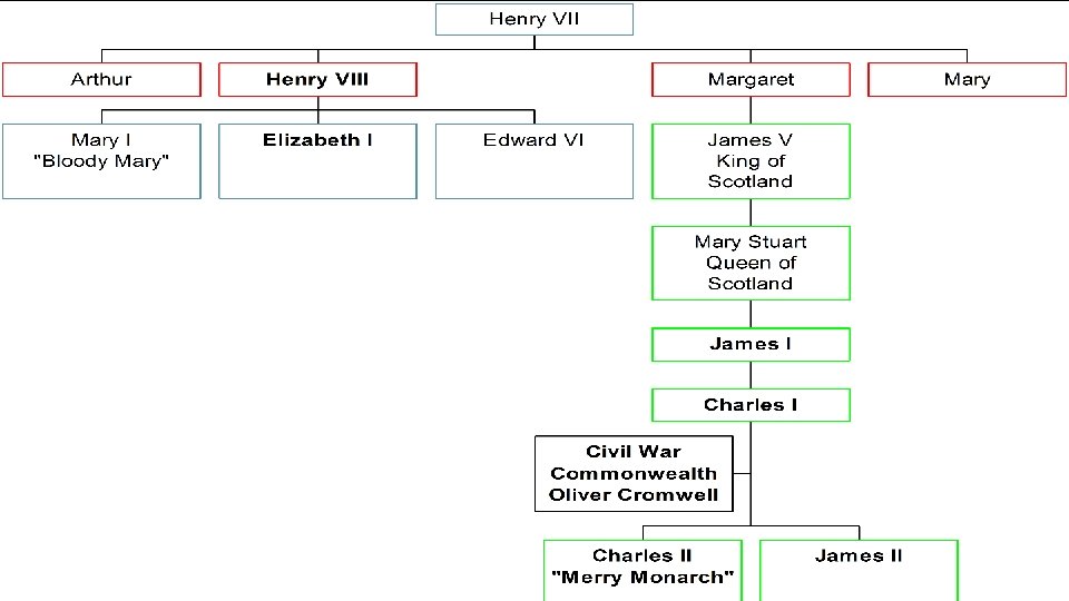 End of Tudor Rule • In 1603 Elizabeth 1 dies • She died without an heir • This official ends the Tudor dynasty • Closet living heir was James VI of Scotland • Mother was Mary Queen of Scots, cousin to Elizabeth I • He assumes the throne and becomes James I of England
