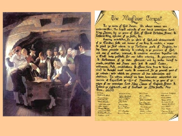 The Mayflower Compact - The Pilgrims wanted their own laws and rules to govern the colony. - The male passengers signed the Mayflower Compact, Compact a legal contract in which they agreed to have fair laws to protect the general good. - This represents the first attempt at selfgovernment in the colonies.