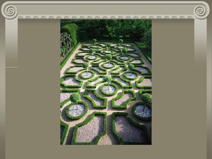 This painting demonstrates the geometry and subordination of nature that garden architects used to construct gardens in the 17 th century. This is an artist's view of Versailles, as constructed by Le Notre, a famous garden architect.