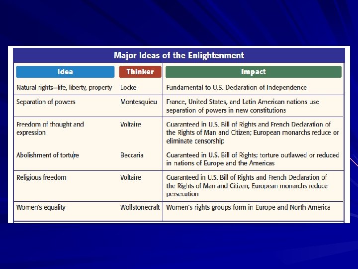 Basic Principles of the Enlightenment Humans behave according to natural laws based on reason Human beings can and should be educated (to reason for themselves) Religions that relied on faith or refused to tolerate diversity were wrong Society’s goals should center on improvements in material and social life