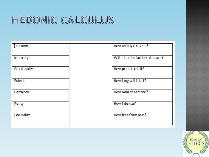 His Principle of Utility therefore promotes the greatest good for the greatest number. Bentham composed a hedonic calculus as a tool for weighing up the consequential pleasure and pain that results from an action in order to be able to work out whether that action was GOOD or not. This is to be done on a case by case basis with no strict or absolute rules.