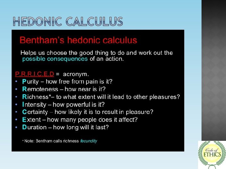 Jeremy Bentham was an advocate of hedonism; theory that the most useful thing to do and therefore the moral thing to do is the maximisation of pleasure and the minimisation of pain. His Principle of Utility therefore promotes the greatest good for the greatest number. Bentham composed a hedonic calculus as a tool for weighing up the consequential pleasure and pain that results from an action in order to be able to work out whether that action was GOOD or not.