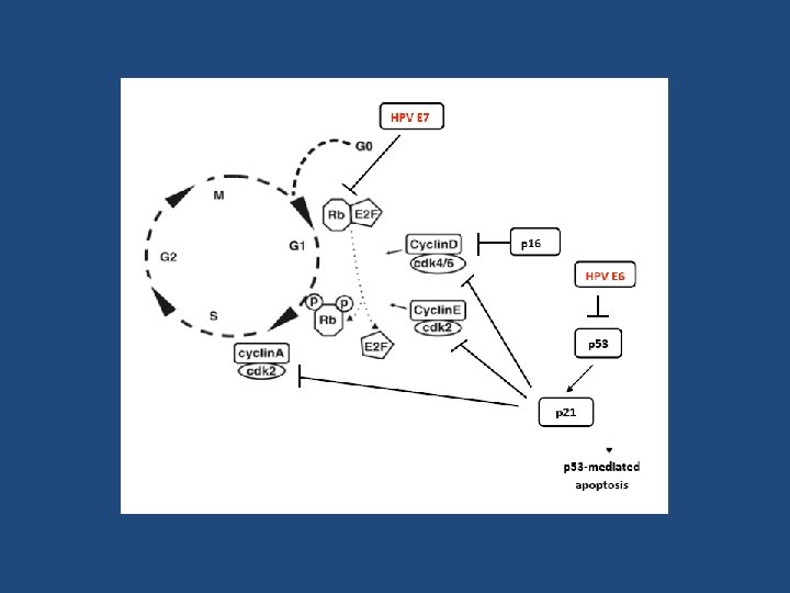HPV Oncogenic Effect • Primarily stems from action of E 6 & E 7 viral oncoproteins – E 6 binds and inactivates p 53 tumor suppressor • Loss of p 53 mediated apoptosis – E 7 binds and inactivates p. Rb tumor suppressor • Loss of G 1 -S phase checkpoint • p 16 overexpression is a surrogate marker for HPV-mediated SCCHN