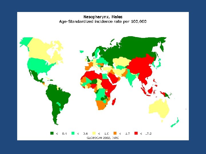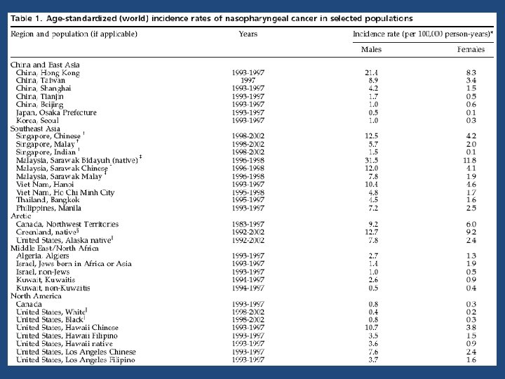 Migrant Studies • After migration, risk remains high – Chinese in US have 10 -20 fold increased risk compared to US Whites and Blacks – However, Chinese immigrants have ½ the risk of their counterparts in China – Conversely, Whites born in China or Philippines have an increased risk for NPC compared with US • Suggests both environmental and genetic components