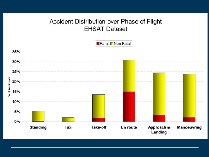 Scope of analysis Data driven approach Accidents (definition ICAO Annex 13) Date of occurrence year 2000 - 2005 State of occurrence located in EASA Member States Where a final report from AIB is available Preliminary results presented Portugal – Oct. 08 186 accidents Interim results presented IHSS, Canada – Sep. 09 303 accidents Estimated to be some 75% of the published reports Published on the EHEST website Final report 2000 -2005 planned mid 2010