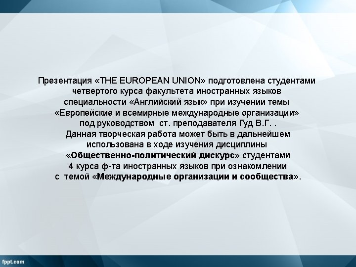 EU institutions and other bodies • There are 3 main institutions involved in EU legislation: the European Parliament, which represents the EU’s citizens and is directly elected by them; the Council of the European Union, which represents the governments of the individual member countries. The Presidency of the Council is shared by the member states on a rotating basis. the European Commission, which represents the interests of the Union as a whole.