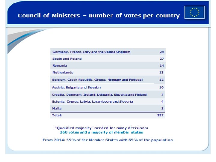 Council of Ministers • Forum in which national members express their national preferences • Rotates the Presidency of Council equally among member states • Members appointed by member states • Most important duty is to pass laws • Complex weighted voting depending on members pop. Size
