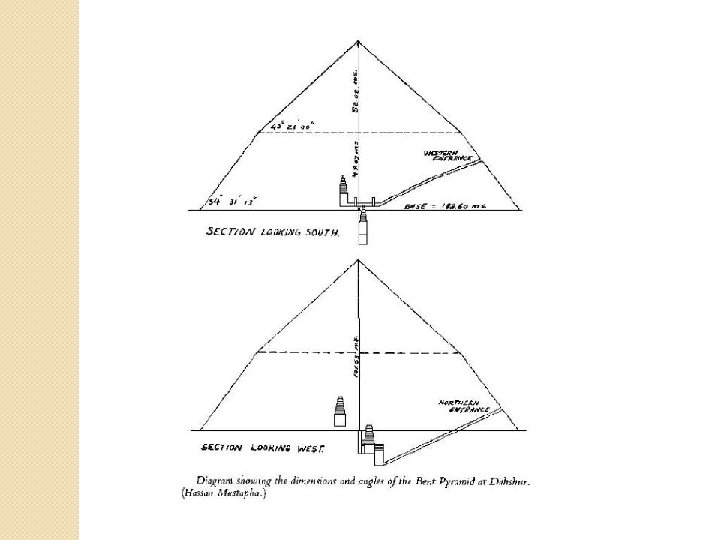 Snefru’s Bent Pyramid at Dashur �First attempt at the classic shape �Built on gravel and not solid bedrock �Inside it is very dangerous because burial chamber is held together with huge cedar beams �Much larger casing stones used �Casing blocks inclined inward �At nearly 50% complete, the internal chambers and the corners started to crack �Unprecedented two burial chambers, each with a separate entrance