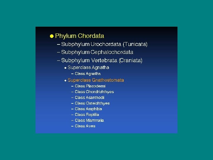 So: make sense out of it for classification 1. How to strengthen skeleton and lighten skeleton 2. bony fish = osteichthyes – turn internal cartilagenous skeleton into bone for greater strength, and lighten external armor 3. cartilagenous fish = chondrichthyes – keep internal cartilagenous skeleton, but add some calcium salt, turn external armor into ‘denticles’ = tooth like scales 4. note; teeth = denticles in mouth. 5. So 6. Placoderms = armored = ancestral