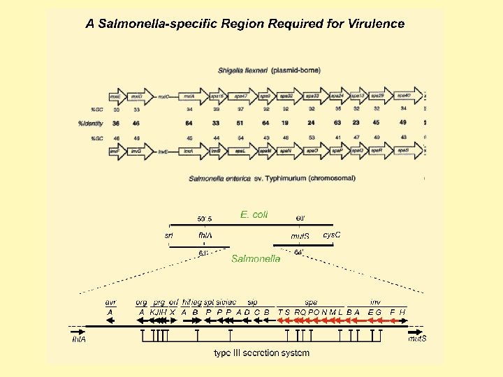 The genes for host cell invasion are the same, but were acquired independently by lateral gene transfer, in Salmonella and Shigella TTSS Plasmid-borne 34% G+C Shigella E. coli TTSS Chromosomal 46% G+C Salmonella Klebsiella The overall base composition of E. coli, Shigella & Salmonella is 52% G+C