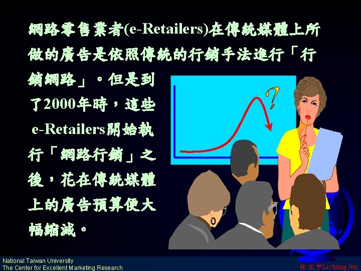 1999年,傳統媒體上(電 視、廣播、報紙)充斥著 dot com 公司的廣告,不 斷的提醒、刺激消費者上 網購物。 National Taiwan University The Center for Excellent Marketing Research 任立中Lichung Jen