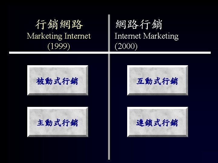 被動式行銷 Reactive Marketing 網路行銷 行銷網路 Internet Marketing Internet National Taiwan University The Center for Excellent Marketing Research 任立中Lichung Jen