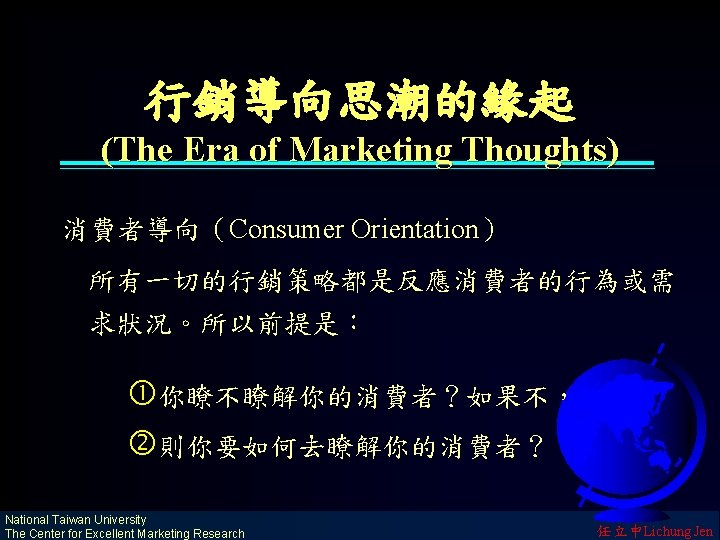 The Evolution of Marketing Era Orientation: Business philosophy focusing on consumer wants and needs; any supply/demand situation Dominant time period: Last half of 20 th century National Taiwan University The Center for Excellent Marketing Research 任立中Lichung Jen