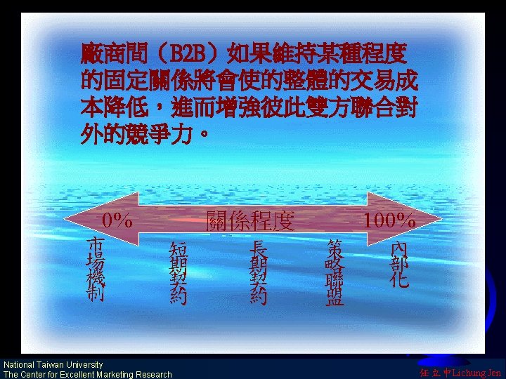 連鎖式行銷(Chain-reaction Marketing) Network orientation F Future perspective F Neural Supply-Demand System F Strategic focus F WWW WWW National Taiwan University The Center for Excellent Marketing Research 任立中Lichung Jen