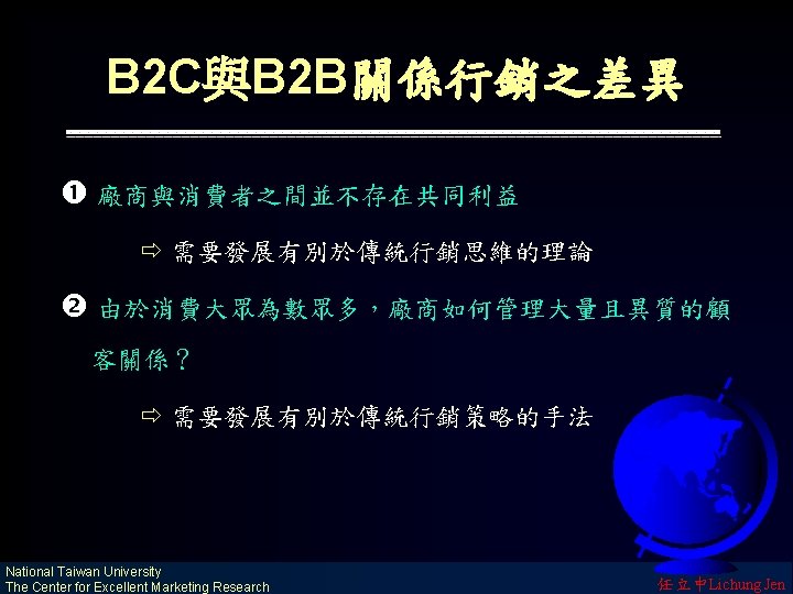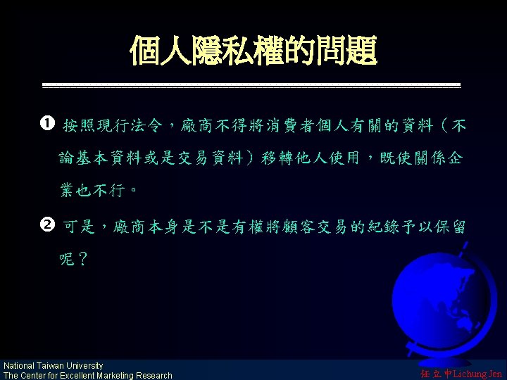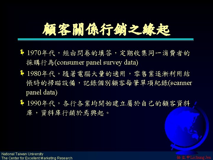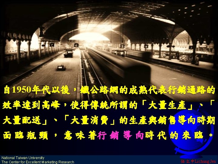 市場的演進 The Revolution of Market 鐵路網(早期)與公路網(近期)創造了國內 市場(National Market) 海運網(早期)與航空網(近期)創造了國際 市場(International Market) 電訊網(早期)與 WWW(近期)創造了全球 市場(Global Market) National Taiwan University The Center for Excellent Marketing Research 任立中Lichung Jen