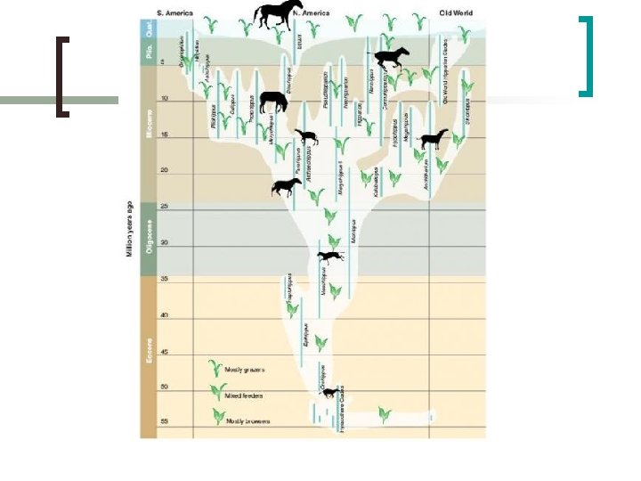 Merychippus ¡ Lived ~ 20 million years ago ¡ Completely new type of horse ¡ Evolved in North America ¡ Adapted to hard grasses of plains ¡ Beginning of grazing horse of today