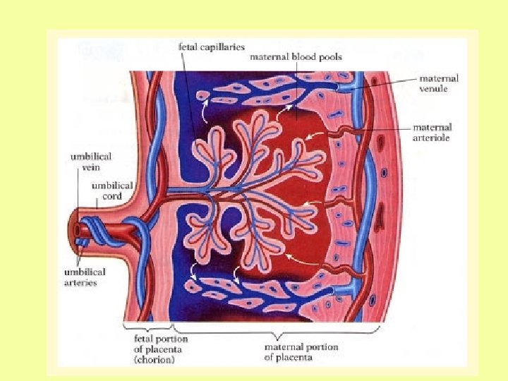 Stages of Maternal-Offspring interactions (2) Invasion of the placenta (a) Conceptus free in lumen of uterus for about a week, implants, (b) nourished without placenta for most of 1 st trimester, then placenta (c) develops from fetal extra embryonic tissue, in late first trimester MOTHER: spiral arteries develop, to supply placenta, fetus with blood; tough endometrial matrix develops, first around spiral arteries FETUS: placental tissue invades spiral arteries, remodels them into largediameter, low-resistance vessels CONSEQUENCES: (1) Fetus gains direct access to maternal arterial blood. Mother cannot reduce nutrient content of blood reaching placenta without reducing nutrient supply to her own tissues (2) Volume of blood reaching placenta cannot be restricted by mother (3) Placenta can release hormones and other substances directly into mother’s blood, and monitor the content of mother’s blood