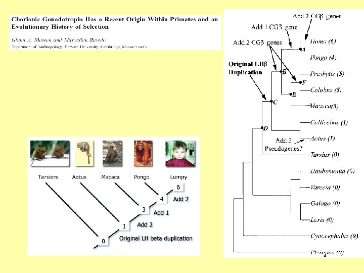 Scenario for evolution of subversion by h. CG (1) Mother alone maintains early pregnancy via LH, regulated to maximize her inclusive fitness (2) Embryo is selected to also produce LH, released into mother’s bloodstream, to help maintain the pregnancy (3) Mothers selected for reduced LH production, to abort less-vigorous fetuses -> ‘arms race’ ensues (4) Series of gene duplications involving gene for LH, evolution of h. CG gene via positive selection (1) (baby evolves subversion, mom evolves ability to abort (2) subnormal embryos) The gene for one of the two h. CG subunits (CGbeta subunit, CGbeta) arose by duplication from the luteinizing hormone beta subunit gene (LHbeta)