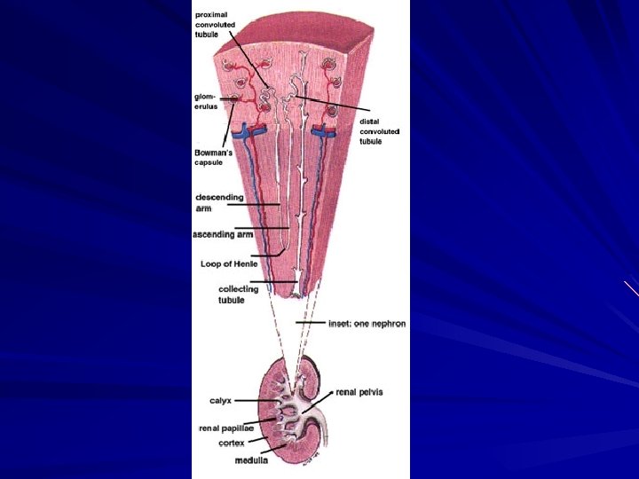 Kidney action (cont) The filtrate reaches the end of the proximal tubule and the fluid is isotonic with the surrounding cells. Glucose and amino acids have been removed from the filtrate. The filtrate then moves to the loop of Henle whose primary function is to remove water from the filtrate by osmosis.