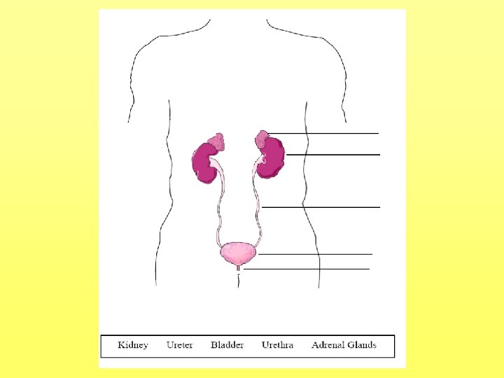 Function of Kidneys • Remove wastes and excess substances (e. g. sugar) from blood and excrete them into the ureters. • Return purified blood to the renal vein • Regulate the water and mineral content of the blood