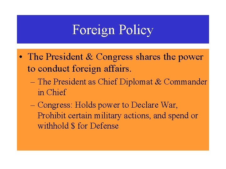 Foreign Policy • The President & Congress shares the power to conduct foreign affairs. – The President as Chief Diplomat & Commander in Chief – Congress: Holds power to Declare War, Prohibit certain military actions, and spend or withhold $ for Defense