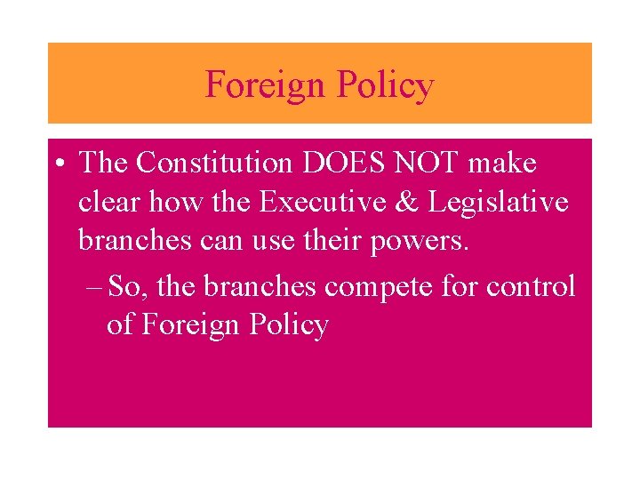 Foreign Policy • The Constitution DOES NOT make clear how the Executive & Legislative branches can use their powers. – So, the branches compete for control of Foreign Policy