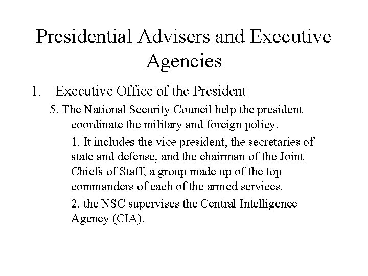 Presidential Advisers and Executive Agencies 1. Executive Office of the President 5. The National Security Council help the president coordinate the military and foreign policy. 1. It includes the vice president, the secretaries of state and defense, and the chairman of the Joint Chiefs of Staff, a group made up of the top commanders of each of the armed services. 2. the NSC supervises the Central Intelligence Agency (CIA).