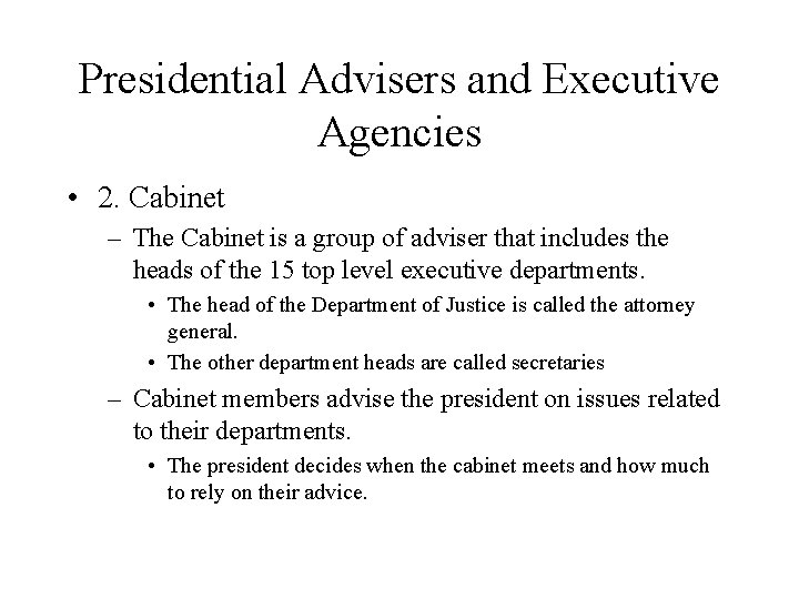 Presidential Advisers and Executive Agencies • 2. Cabinet – The Cabinet is a group of adviser that includes the heads of the 15 top level executive departments. • The head of the Department of Justice is called the attorney general. • The other department heads are called secretaries – Cabinet members advise the president on issues related to their departments. • The president decides when the cabinet meets and how much to rely on their advice.