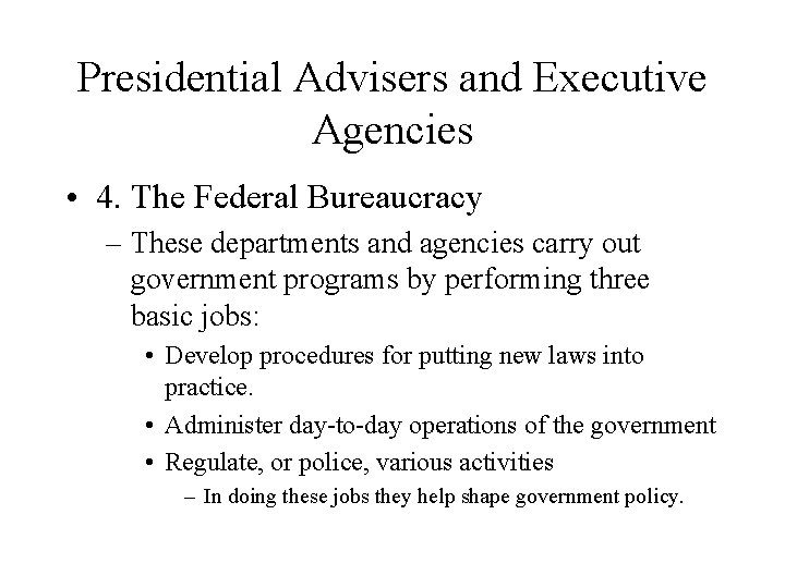 Presidential Advisers and Executive Agencies • 4. The Federal Bureaucracy – These departments and agencies carry out government programs by performing three basic jobs: • Develop procedures for putting new laws into practice. • Administer day-to-day operations of the government • Regulate, or police, various activities – In doing these jobs they help shape government policy.