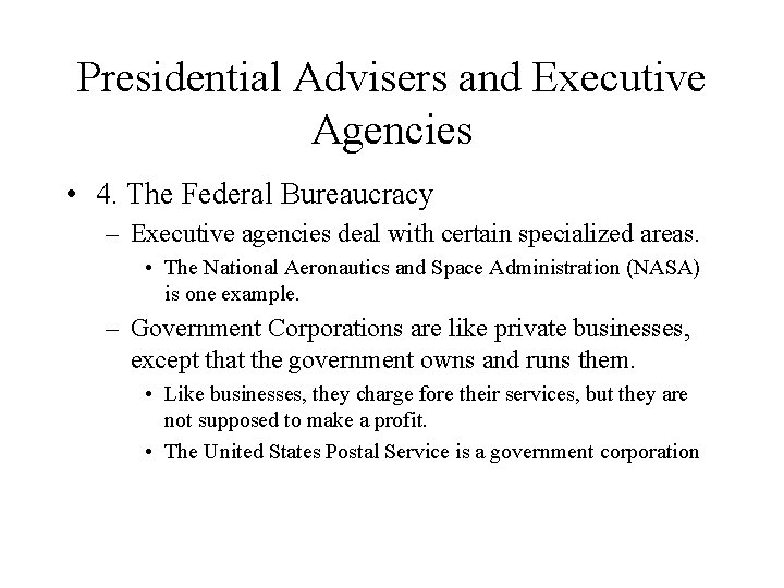 Presidential Advisers and Executive Agencies • 4. The Federal Bureaucracy – Executive agencies deal with certain specialized areas. • The National Aeronautics and Space Administration (NASA) is one example. – Government Corporations are like private businesses, except that the government owns and runs them. • Like businesses, they charge fore their services, but they are not supposed to make a profit. • The United States Postal Service is a government corporation