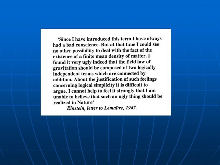 De Sitter’s Accelerating Universe Always expanding exponential curve R = exp[t ( /3]) No matter – only It has no beginning and no end (1917) Willem De Sitter 1872 -1934