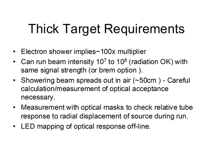 THICK TARGET STAGE • Pass electron beam through varying amounts of ~ air equivalent showering material (Al 2 O 3). • Measure light yield as a function of depth in the shower ( sample light from a wide range of electron energies). – Is fluorescence proportional to d. E/dx? – What are the contributions of low-energy (<1 Me. V) electrons? – Can existing shower models (EGS, GEANT, CORSIKA) correctly predict fluorescence light? – How does the fluorescence yield in an air shower track the shower development?