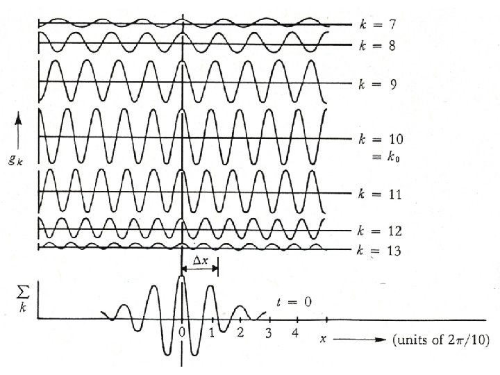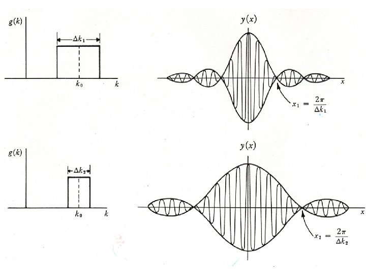 NOTE: The spatial distribution depends on the particular frequencies involved x 1 x k k = 2 Two waves of slightly different wavelength and frequency produce beats.