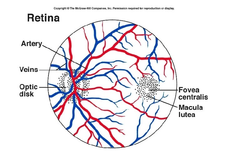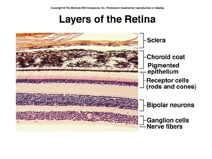 3. Nervous Tunic – Retina several layers “inside out” Pigmented epithelium Rods and Cones (photoreceptors) Bipolar cells Ganglion cells (vitreous humor) Light is focused by cornea and lens on the Fovea centralis (“central pit”)which is in the center of the Macula lutea (“yellow spot”) The third refractive component is the length of the eyeball.