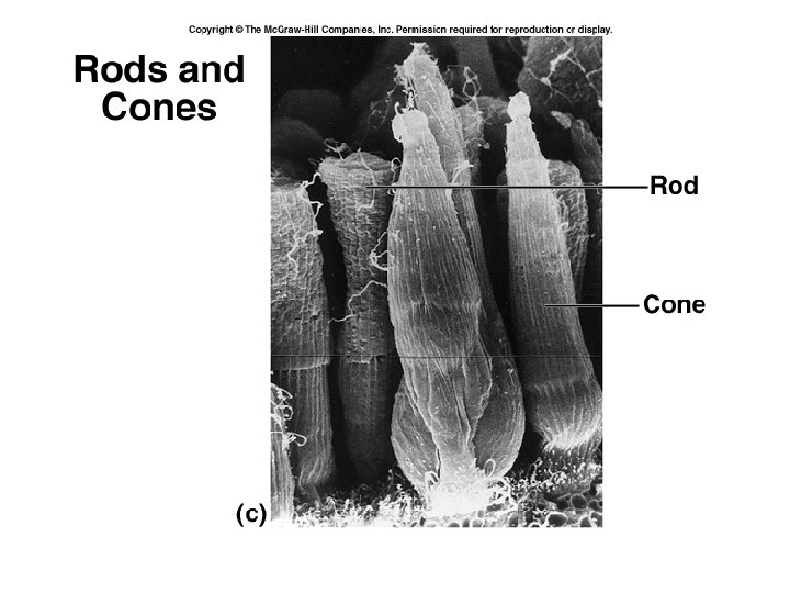 Rods: Can see in dim light See in black and white Respond to movement Found more in periphery Cones: Require more light See in color Give best acuity More central, esp. in fovea centralis