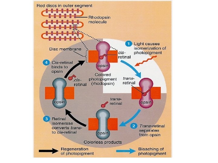 When light strikes the retina, retinal (from vitamin A) which is bent, straightens out, and no longer fits into the opsin. The two separate – this is called bleaching. The opsin becomes an active enzyme, that activates other enzymes that break down cyclic GMP. Without cyclic GMP, the Na+ channels close.
