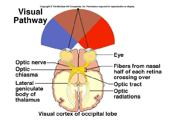 Stereopsis Use both eyes to perceive depth – “depth perception” Nasal fibers cross at the optic chiasm Temporal fibers do not cross over Each visual cortex (R &L) receives information from both eyes so it can compare what each eye sees.