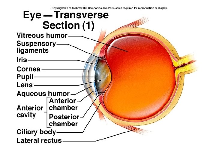 Lens – avascular, clear, elastic contains proteins called crystallins becomes opaque = cataract Iris – pigmented, divides anterior and posterior chamber Aqueous humor – drains into scleral venous sinus (Schlemm’s canal) intraocular pressure - glaucoma