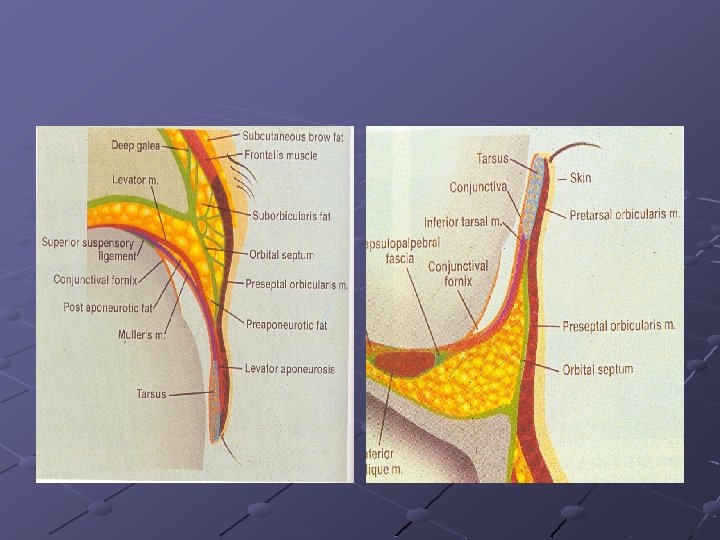 Normal Anatomy Both the upper & lower eyelids have similar structure They consist of an anterior lamella (skin & orbicularis muscle) and a posterior lamella (tarsal plate & conjunctiva)