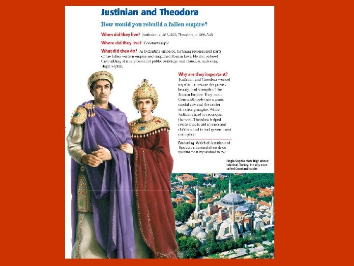 Eastern emperors ruled from Constantinople and tried but failed to reunite the whole Roman Empire. • He made two enemies who would have run him out of Constantinople had his wife, Theodora, convinced him to stay. –Theodora was smart and powerful, and advised Justinian on how to end the riots.