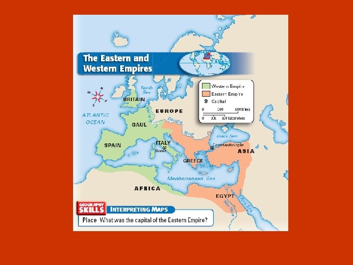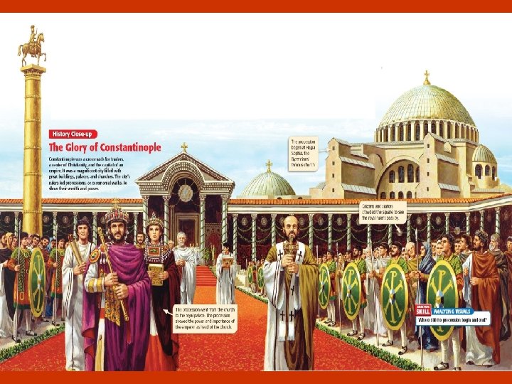 Main Idea 2: The people of the eastern empire created a new society that was very different from society in the west How the eastern empire differed from the western empire • The society was called the Byzantine Empire. • People studied Greek, not Latin. • They traded with and were influenced by other cultures. • Emperors had more power and were thought to be chosen by God. They had both political and religious power.