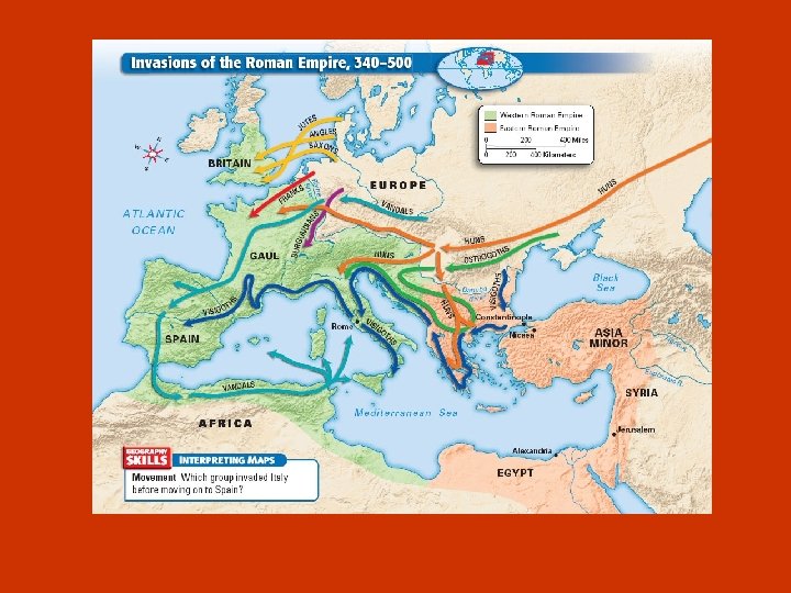 • Germanic tribes attacked Rome at the Battle of Adrianople • Odoacer’s overthrow of the emperor of the Western Roman Empire in AD 476, marked the end of the Western Roman Empire.