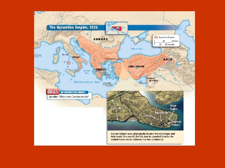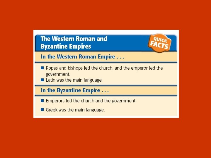 Main Idea 3: Byzantine Christianity was different from religion in the west. • People in the East and West began to interpret elements of Christianity differently. –Eastern priests could get married, but Western priests could not. –Religious services were performed in Greek in the East and in Latin in the West. • The East broke away from the West and formed the Eastern Orthodox Church.