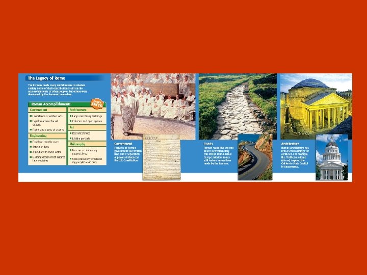 Roman advancements in engineering, architecture, art, and philosophy helped shape later civilizations. • Architecture and Art –Romans borrowed from Greek ideas, such as using columns and open space, but made their buildings larger and grander. –Roman art borrowed ideas from the Greeks, such as making their art look realistic.