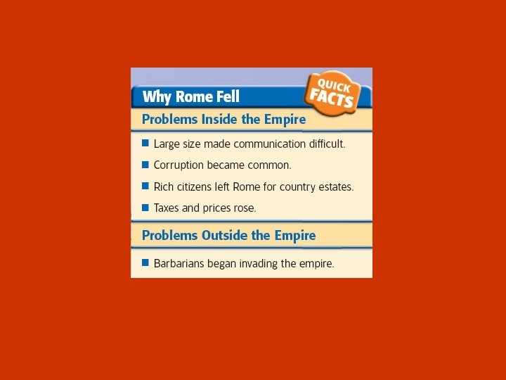Many factors contributed to Rome’s fall. • The large size of the empire made it hard to govern. • Barbarian invasions weakened the empire. • Corruption, or the decay of people’s values, in politics led to inefficiency in government. Bribes and threats were used to achieve goals. • Wealthy citizens began to leave Rome, making life more difficult for those who remained. • Inflation and a weakening economy were factors. • The military used its power to make and remove emperors.