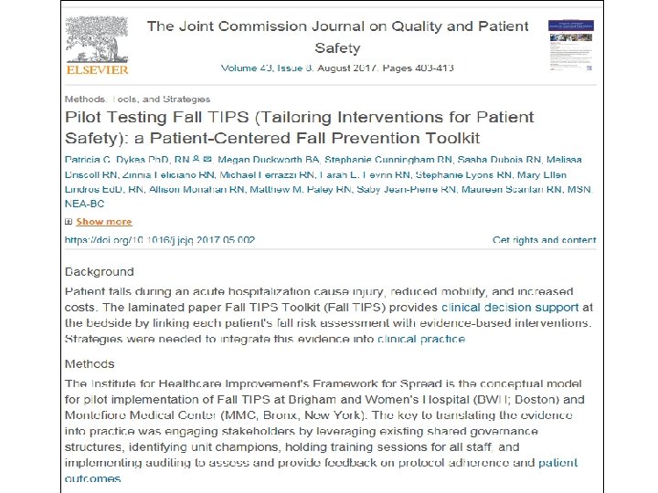 Example: Using the EHR for Fall Prevention Care Planning • Fall TIPS (Tailoring Interventions for Patient Safety) – 2 year mixed methods study funded by Robert Wood Johnson Foundation: • Qualitative phase: – why hospitalized patients fall? – what interventions are effective and feasible in hospital settings? • Randomized control trial: to test an EHR-based fall prevention toolkit designed to address issues identified during qualitative phase. Supported by the Robert Wood Johnson Foundation, Dykes PI