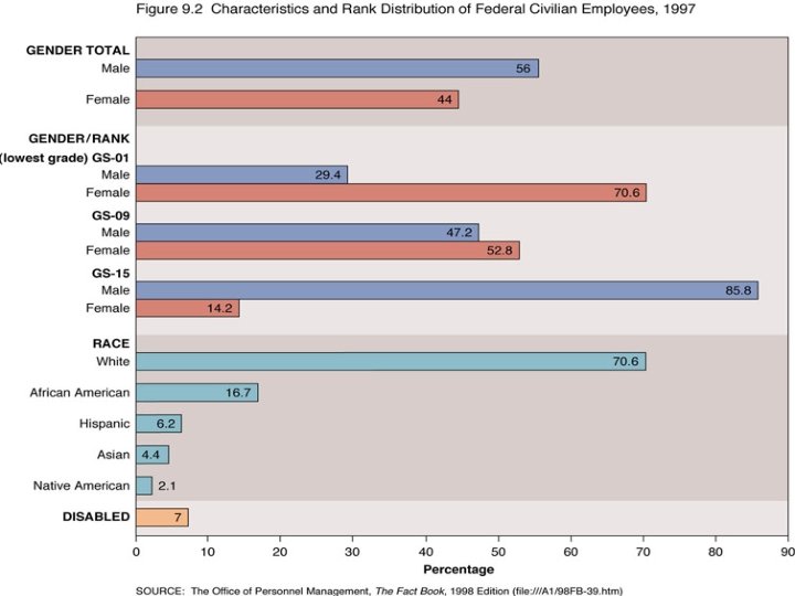 Who are the “Bureaucrats? ” • • 97% are career government employees Only 10% live in the D. C. area 30% work for the D. O. D. Less than 15% work for social welfare agencies • Most are white collar workers: secretaries, clerks, lawyers, inspectors & engineers • Civil employees more diverse demographically than Congress