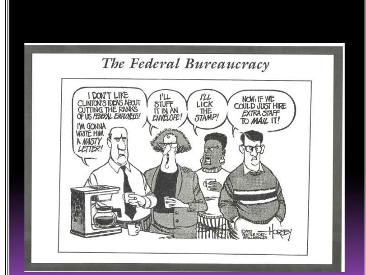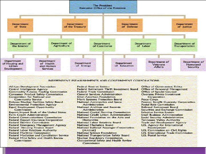 The Federal Bureaucracy Is…. • • • 4 million employees; 2. 8 million are civilians or “civil servants” President only appoints 3% (patronage or political appointments) 15 cabinet level departments 200+ independent agencies with 2, 000+ bureaus, divisions, branches, etc. Biggest - Department of Defense, U. S. Postal Service, Veterans Administration